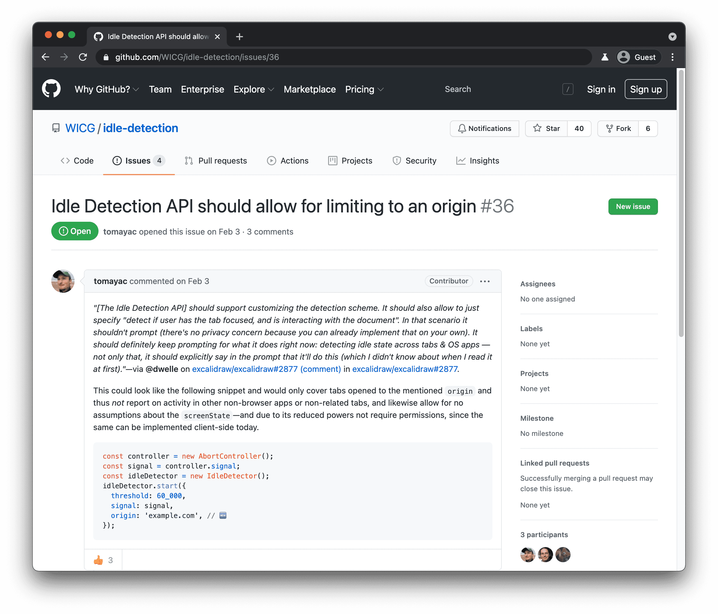 We filed feedback on why the Idle Detection API wasn’t solving the use case we had. All Project Fugu APIs are being developed in the open, so everyone can chime in and have their voice heard!